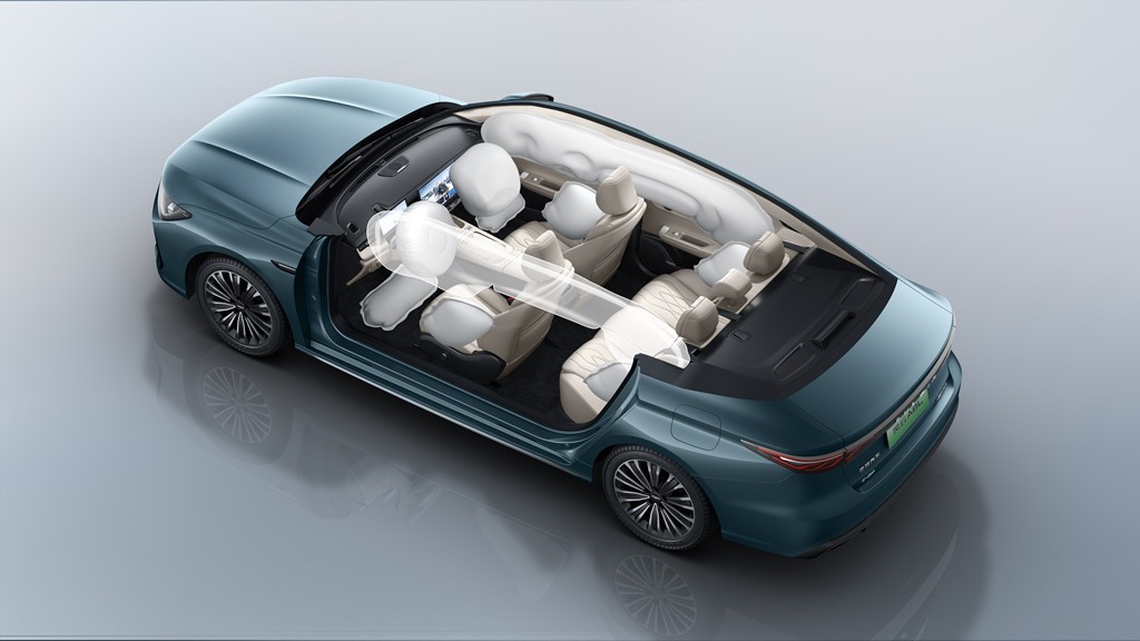 此外,该车还配备了10个安全气囊,(包括第二排侧气囊和膝部气囊),侧气帘能保持6秒以上高保压,保障乘员自身安全。电池防护也更贴心,守护者系统能在2毫秒内断高压电,三级安全防控,极端情况也能降低风险。