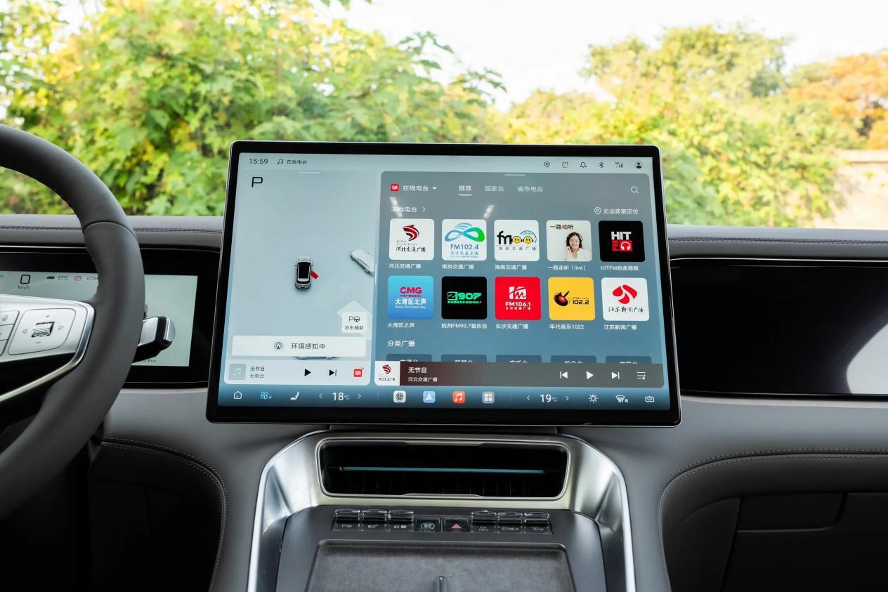 配备13.2英寸液晶仪表和17.3英寸悬浮式中控屏以及13.2英寸副驾娱乐屏,分辨率都是2.5K,显示效果细腻,旗舰型还配备50英寸AR-HUD抬头显示和17.3寸后排娱乐屏以及流媒体内后视镜,支持多屏互动,搭载4nm制程芯片,功耗小,算力高,运行快,操作丝滑流畅,体验感很好。