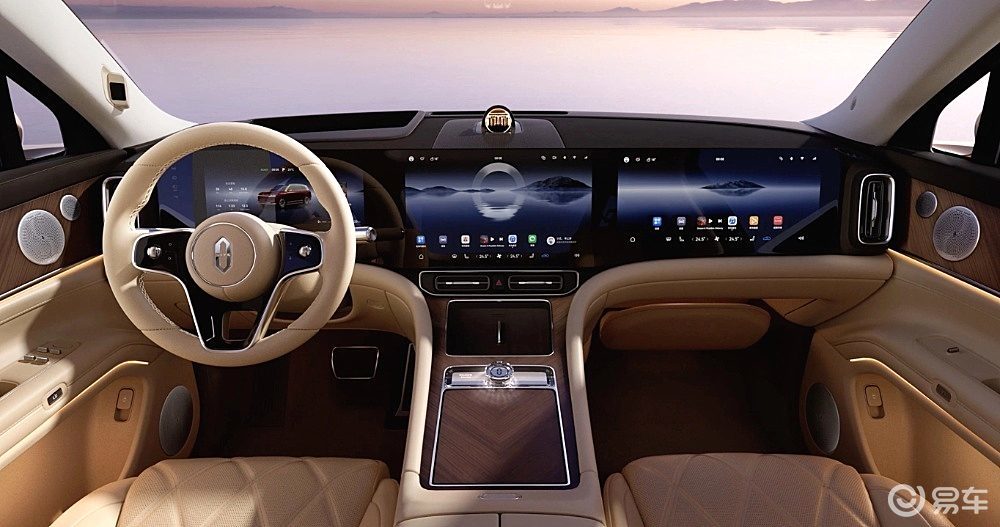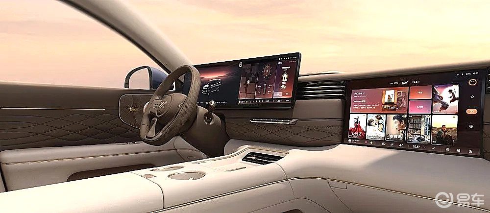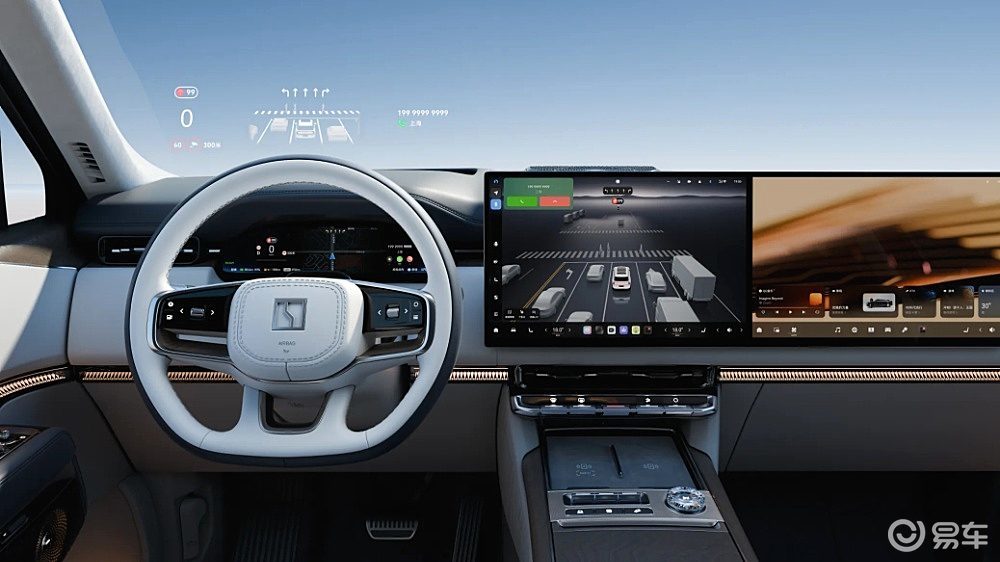 智能座舱方面,智己LS9最吸睛的是27.1英寸的一体式巨幅沉浸屏,分辨率达5K,与15.6英寸副驾娱乐屏共同构成信息与娱乐中心。