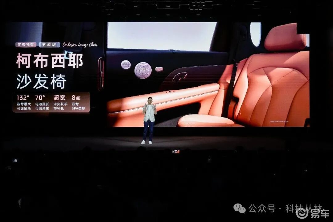 后排也有同级独有的柯布西耶沙发椅,拥有132°大躺角与SPA级按摩,可以在后排彻底舒展双腿。