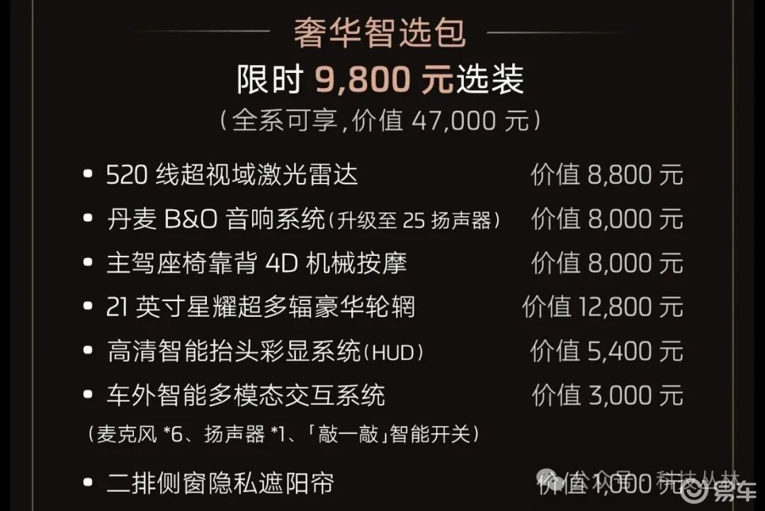 且不说其他,单单这个520激光雷达、B&O音响、4D机械按摩这三项就已经值回票价。