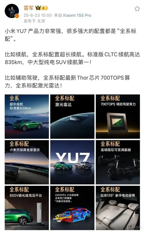 6月23日,小米创办人、董事长兼CEO雷军发文表示:小米YU7(图片)将于6月26日正式上市,并公布小米YU7第5款外观配色——流金粉。雷军表示:小米YU7产品力非常强,标配激光雷达、700TOPS Thor芯片、800V碳化硅高压平台、小米天际屏全景显示等,并强调小米YU7在中大型SUV里续航第一,CLTC纯电续航835km。