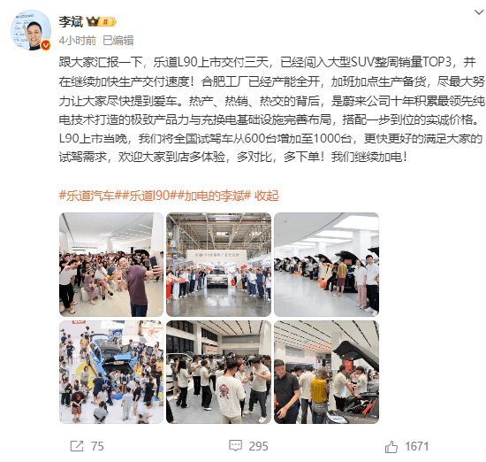8月5日,蔚来CEO李斌在微博发文表示,乐道L90上市交付三天,已经闯入大型SUV整周销量TOP3,并在继续加快生产交付速度。合肥工厂已经产能全开,加班加点生产备货,尽最大努力让大家尽快提到爱车。
