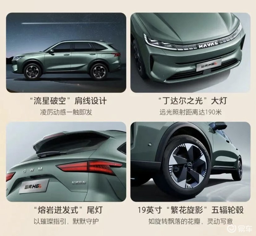 在外观设计上,哈弗H6L采用 「律动自然美学」设计语言,将自然灵感与都市气质完美融合。辨识度极高的丁达尔大灯灵感源自自然光的丁达尔效应,4000 流明光通量与 190 米照射距离,确保全场景照明安全;贯穿式 LED 灯带搭配可发光 「HAVAL」 标识,配合点阵式前格栅与熔岩迸发式尾灯,尽显时尚与科技感,成为都市中一道移动的风景线。